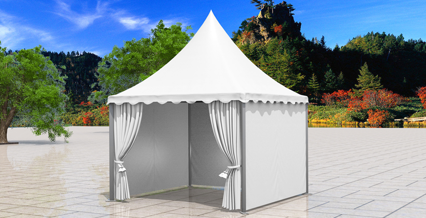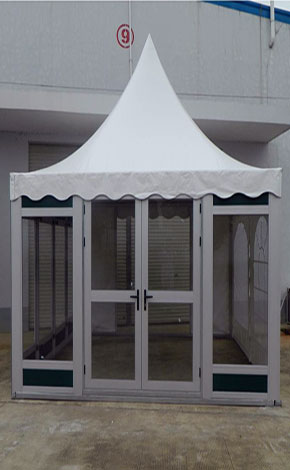 尖頂篷房系列尺寸有3×3米、4×4米,邊高是2.5米,采用二槽的48×84×2.5㎜鋁合金管材做支架。5×5米、6×6和10×10米的尖頂篷房標準邊高是2.5米,用四槽的48×105×3.5㎜鋁合金型材做支架,抗風速80公里/小時。
